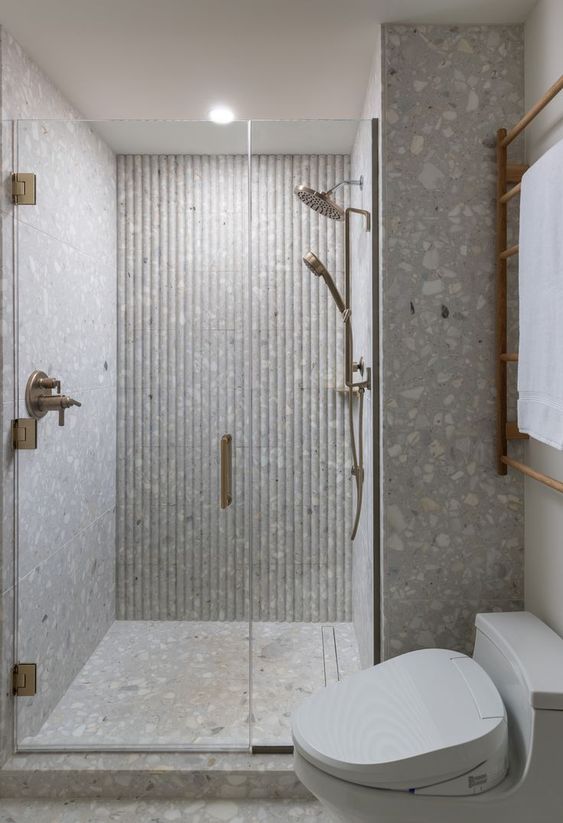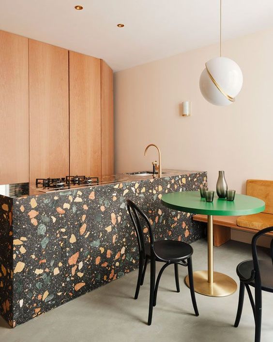 Terrazzo is a type of concrete that contains bits of marble or other stone, popularized in the 1970’s as an alternative to traditional tile floors and walls. According to Karen Okner of Design Collaborative, “Its unique look makes it a popular option for high-traffic areas in homes, such as entryways, kitchens, bathrooms, and family rooms. Terrazzo tile is also durable, long-lasting and easy to maintain, making it a great choice for homeowners looking for a flooring option that will stand the test of time.” This spunky tile is available in a variety of colors and finishes, ranging from finely speckled to a large, bold speckle. Designers are especially loving large-format terrazzo with minimal grout lines, which can make a space look and feel larger and is easy to clean!