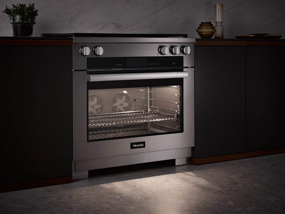 The Miele Gen 7000 cooking experience starts with their range. The dual-fuel model combines a gas cooktop with electric oven featuring 2 convection fans in the back to create precise, even heat. Available as separate wall unit and cooktop for kitchen design flexibility.