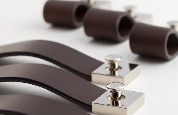 Available in diverse styles and colors, Turnstyle’s leather collection uses leather and metal to create an engaging and stimulating cabinet and door aesthetic.