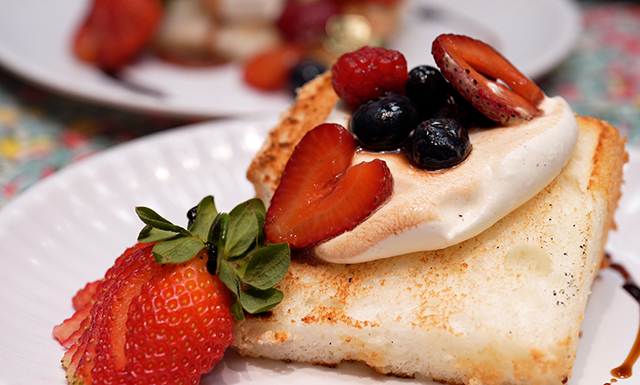 Grilling slices of angel food cake adds a special touch this fruit laden dessert. Shown here on the Evo Grill. Click here for the recipe.