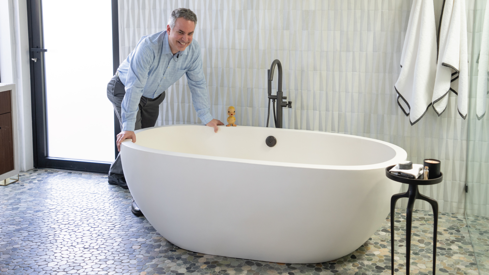 Tim West, Native Trails representative, talks about the beautiful Native Trails tub selected by Designer Chris Barrett for the Primary Suite in the Desert Oasis Designer Show House in Indian Wells, CA.